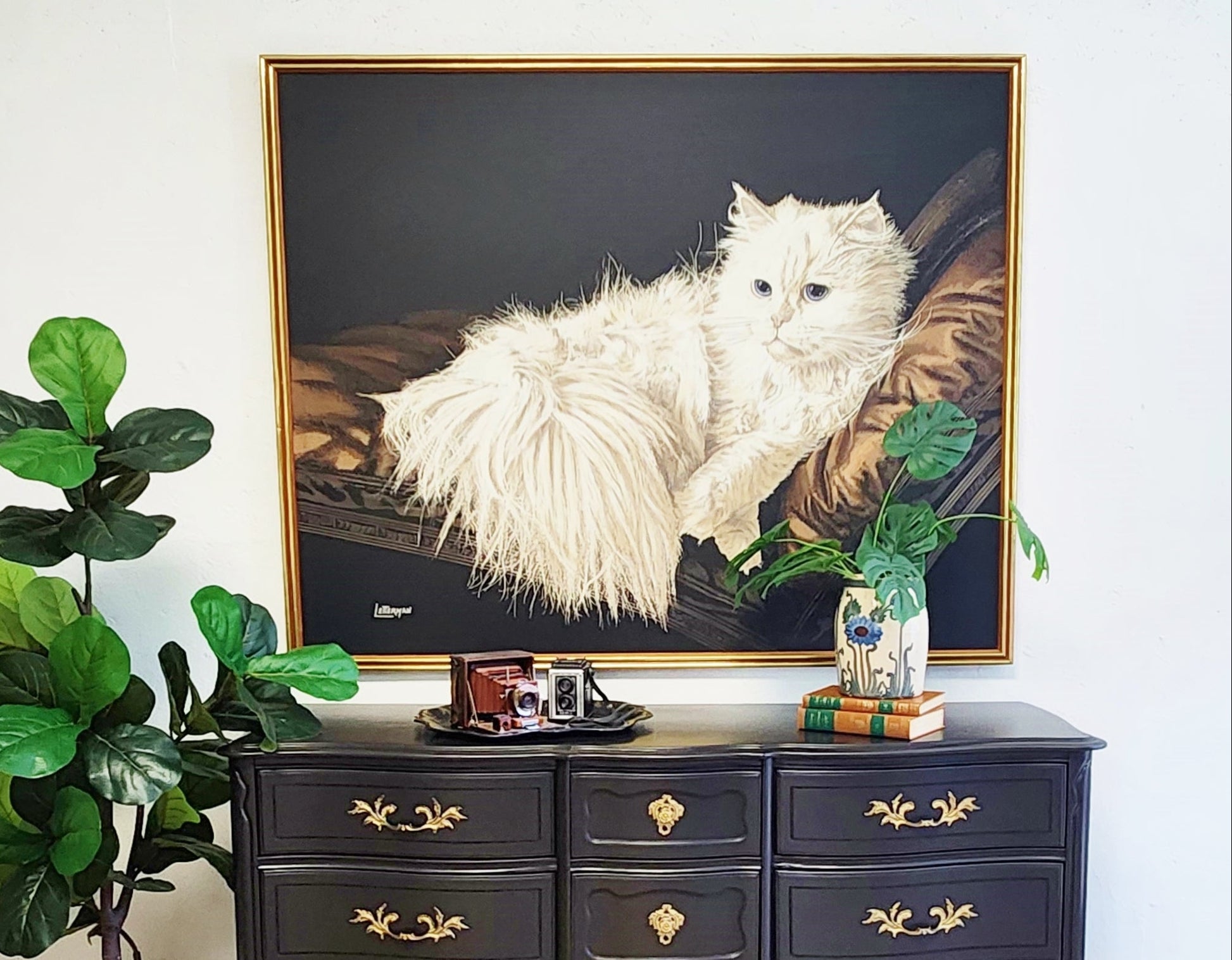 Vintage Antoinette Letterman textured Giclee print of her painting "The Resting Cat" or "Cashmere" Gorgeous statement piece in any room! This is oversized at 60 x 48 inches, and has a light wood and gold tone frame. (Minor age wear to frame.) Overall excellent condition. The textured, embellished giclee print has a dark background, with iconic Cashmere the Persian cat resting while gazing across the room with big blue eyes. Please see all the photos, zoom in and ask any questions prior to purchase. This will ship via private blanket wrap carrier to your door. IMPORTANT INFO: ~If you have any questions please contact us PRIOR to purchasing the item. ~All sales are final. ~We are more than happy to answer any questions, take video or extra photos prior to purchasing an item. ~Please keep in mind that nearly all items in our shop are vintage and pre-owned. Some items may have vintage wear shown in photos and described in listing. ~Items ship professionally--all orders are carefully packaged and insured and will ship via Fedex within a few days of purchase. Larger items shipping via private blanket wrap transporter can take 1-3 weeks to arrive.