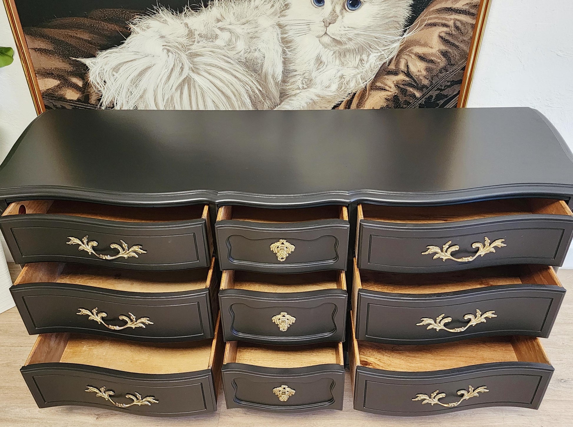 BASSETT French Provincial BLACK Dresser, Buffet, Ornate Solid Wood Refinished 9 Drawer Curvy Console