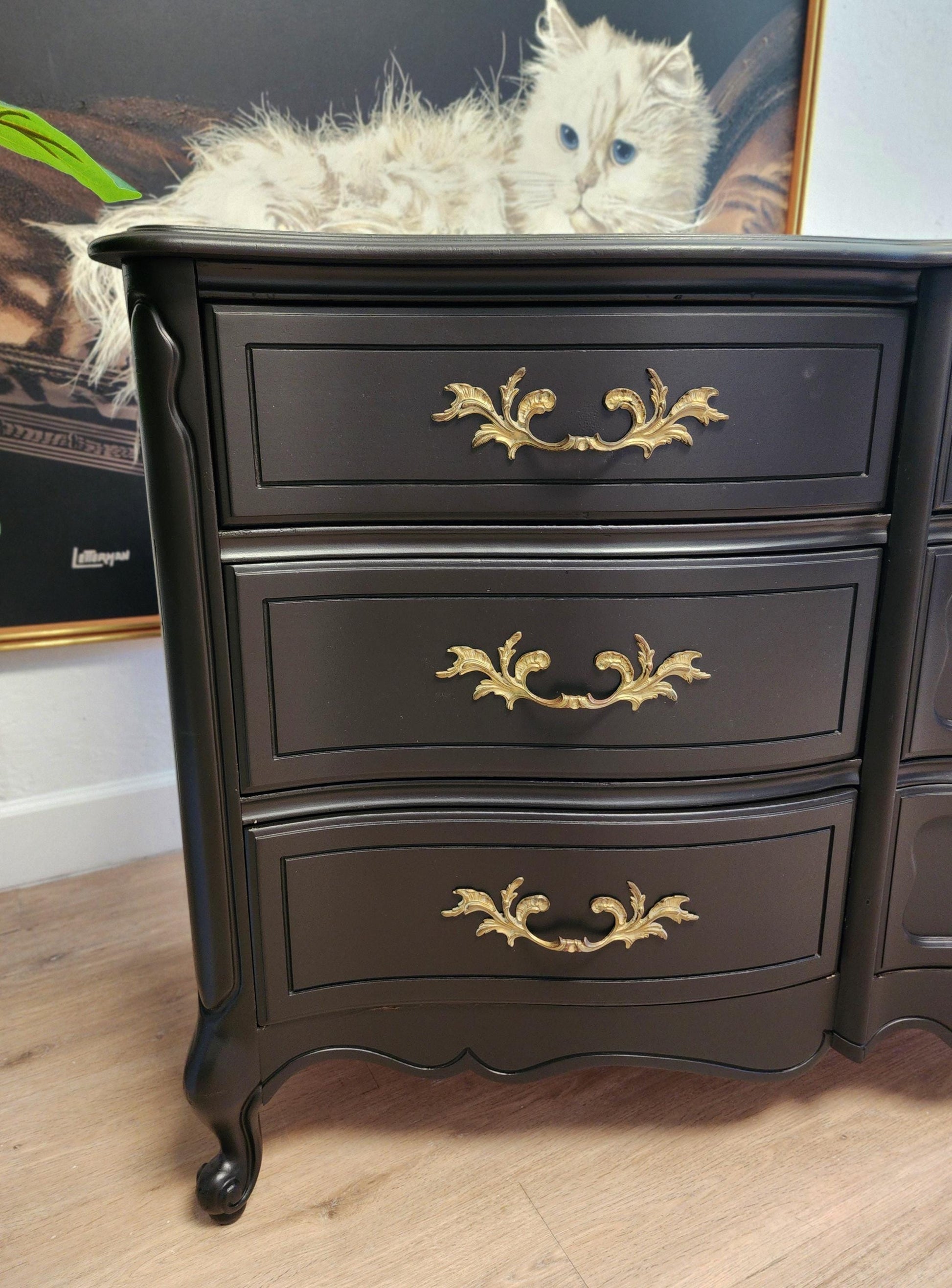 This is a vintage high quality Bassett 9 drawer French Provincial style dresser, newly refinished in warm black, with vintage hand rubbed aged gold ornate pulls. Gorgeous focal point of any room! Tons of storage in the well functioning 6 large side drawers and 3 smaller central drawers. Overall this Bassett piece is well made, heavy, solid and sturdy. Due to its vintage nature, it retains some original age wear/marks/ scratches on the top underneath the new color, not too visible under normal room lighting. New color is a furniture grade, hard wearing sprayed luster finish. Size is approx. 66 inches long x 34 inches tall x 20.5 inches deep. Perfect as a media console, bedroom dresser, entry piece or for that romantic guest room. *Please see all the photos, zoom in and ask any questions prior to purchase.* IMPORTANT INFO: ~If you have any questions please contact us PRIOR to purchasing the item.