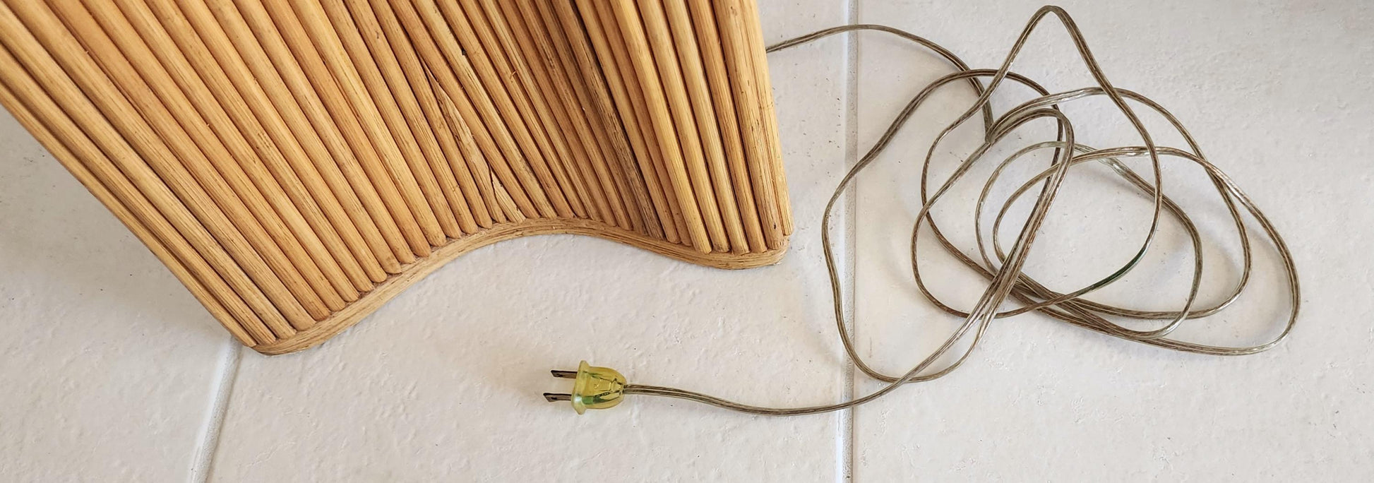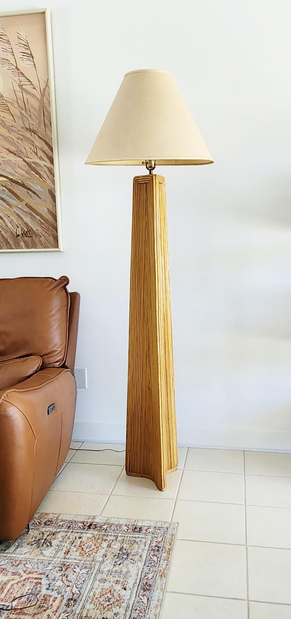 Rare, statuesque sculptural vintage split reed floor lamp. Perfect lighting for your beach house, or coastal Florida style room. Overall excellent vintage condition. Heavy, with a triangular base tapering up in a narrow pyramid shape to the top.