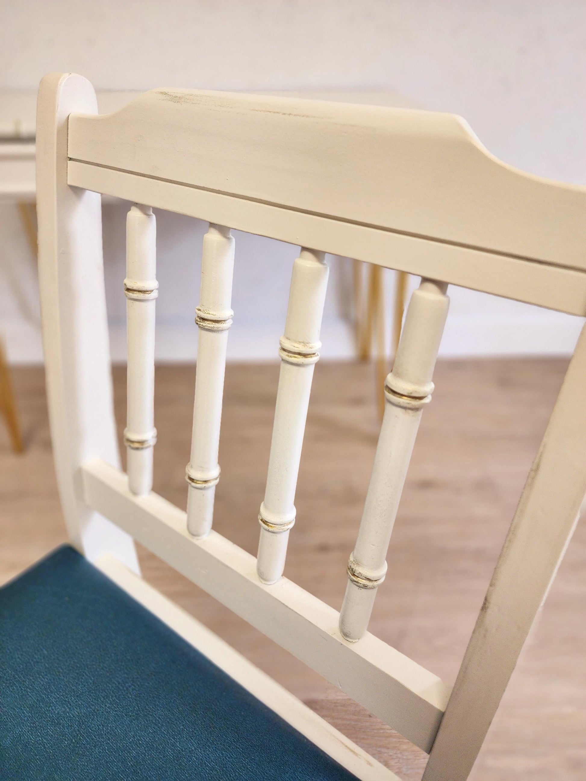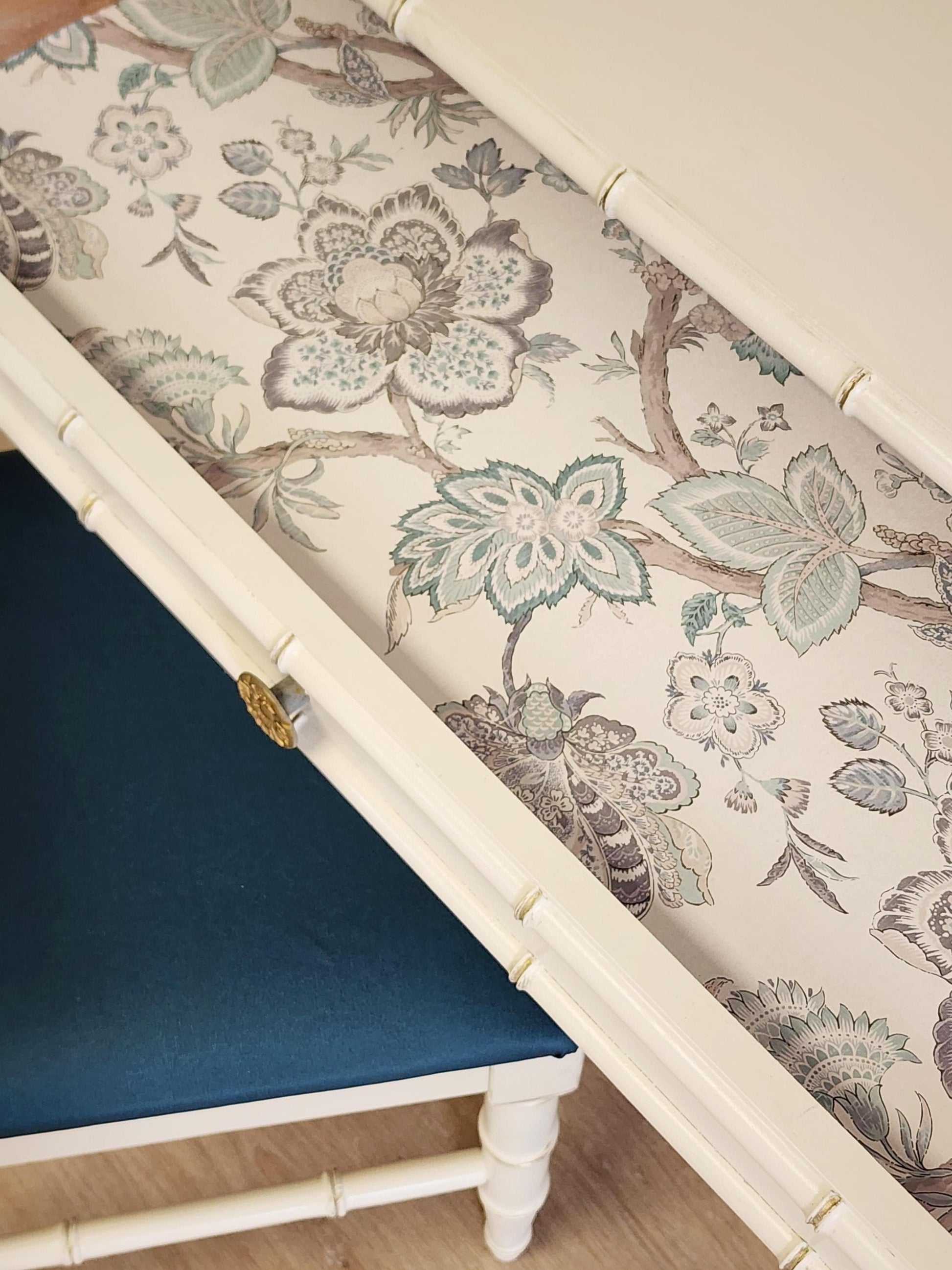 This refreshed vintage Dixie Aloha writing desk & chair has been newly painted in a pale off white with gold accents, new teal vinyl upholstery, and MCM style gold hairpin legs. Coordinating floral paper lines the generously sized 32 inch single drawer. The hard-wearing furniture paint is Linen from Heirloom Traditions, and has been further hand rubbed with a semi-gloss protective polish. This is a solid and sturdy vanity or desk set, a stylish mix of vintage and new. Sizes are approximately: (desk) 36 inches w x 18.5 d x 29 inches tall 24 inch kneehole height 18 inch chair seat height Please see all the photos, zoom in and ask any questions prior to purchase. IMPORTANT INFO: ~If you have any questions please contact us PRIOR to purchasing the item. ~All sales are final. ~We are more than happy to answer any questions, take video or extra photos prior to purchasing an item. ~Please keep in mind that nearly all items in our shop are vintage and pre-owned. Some items may have vintage wear shown in photos and described in listing. ~Items ship professionally--all orders are carefully packaged and insured and will ship via Fedex within a few days of purchase. Larger items shipping via private blanket wrap transporter can take 1-3 weeks to arrive.