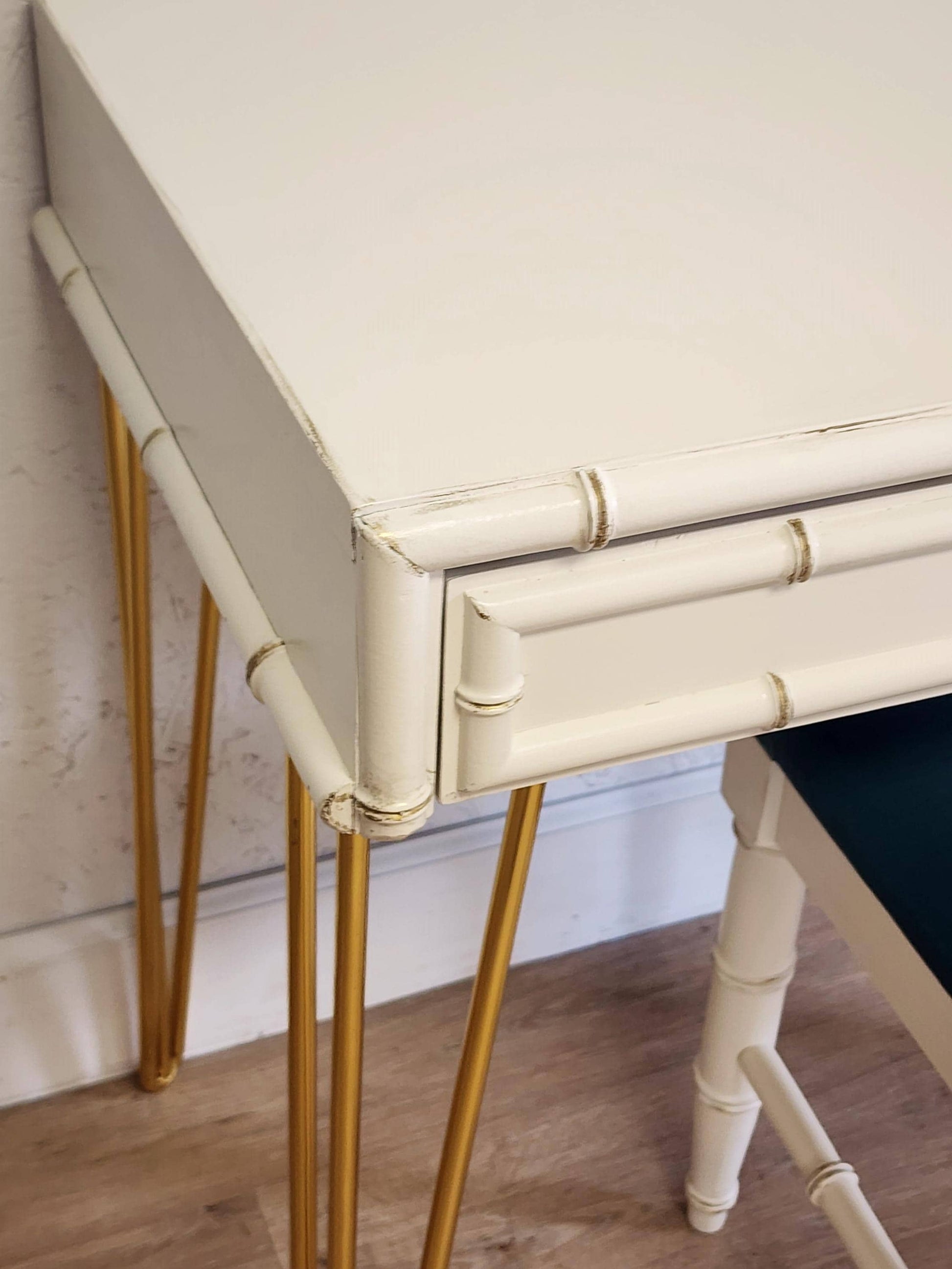 Dixie Aloha Writing Desk, Upcycled Dixie Faux Bamboo & Gold Desk Chair Set, MCM Hairpin Bamboo Console Desk, Hollywood Regency Vanity Desk