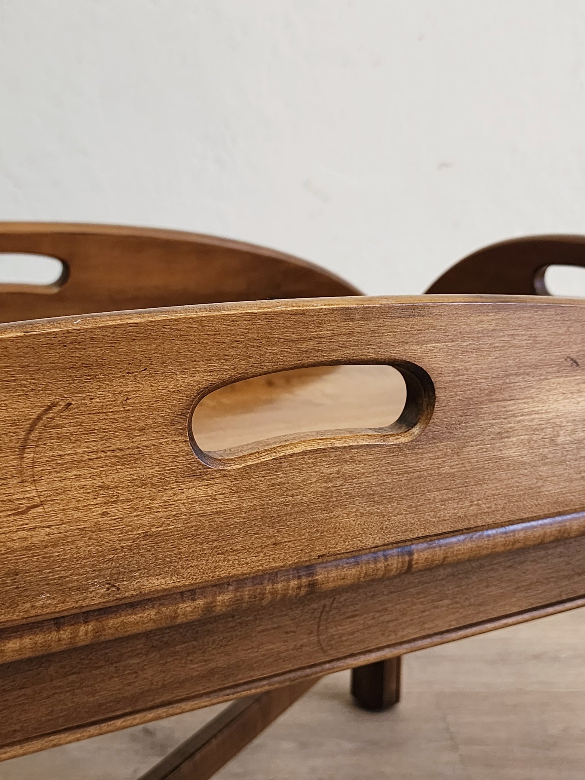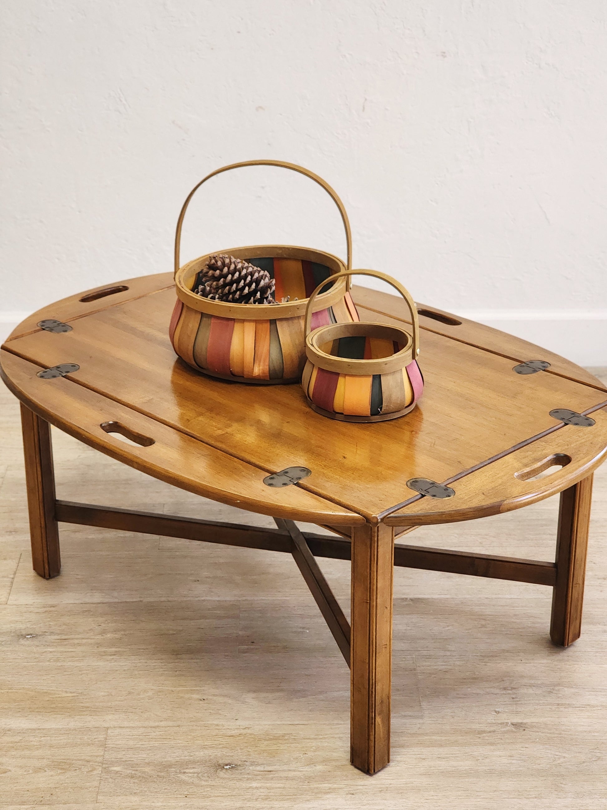 Overall excellent vintage condition. Solid wood, quality Ethan Allen butler's tray style coffee table. The sides can lay flat for an oval table, or up for a rectangular table. Fixed, top does not lift off.