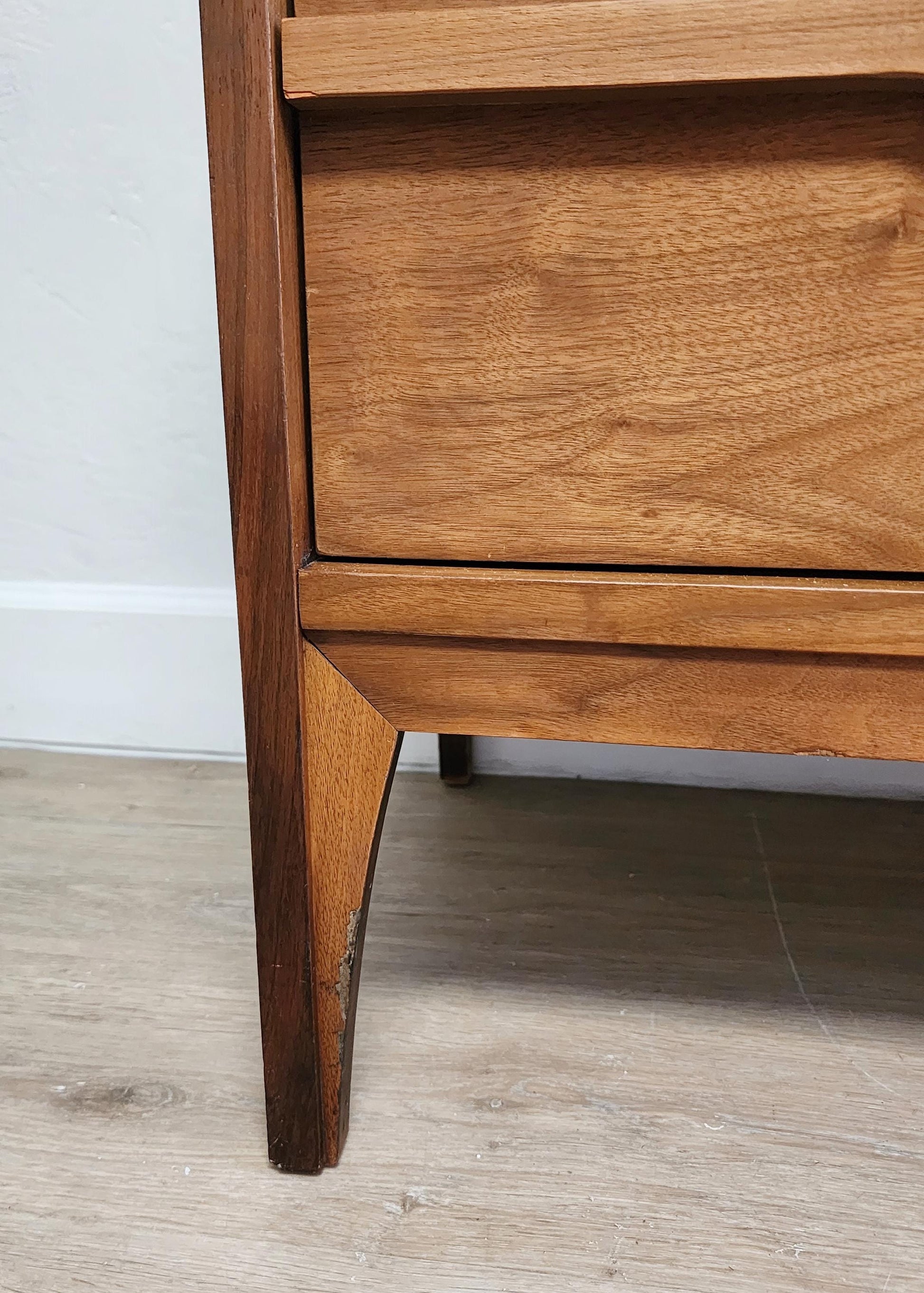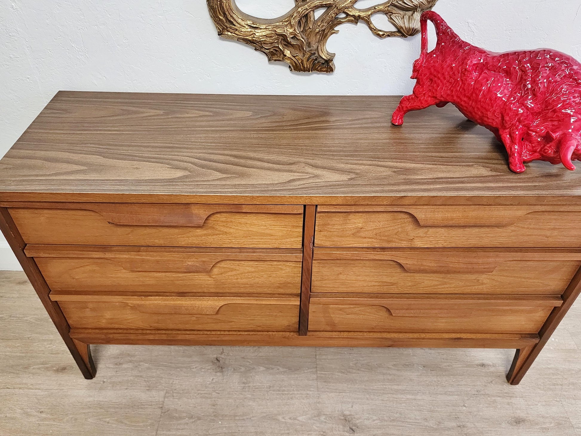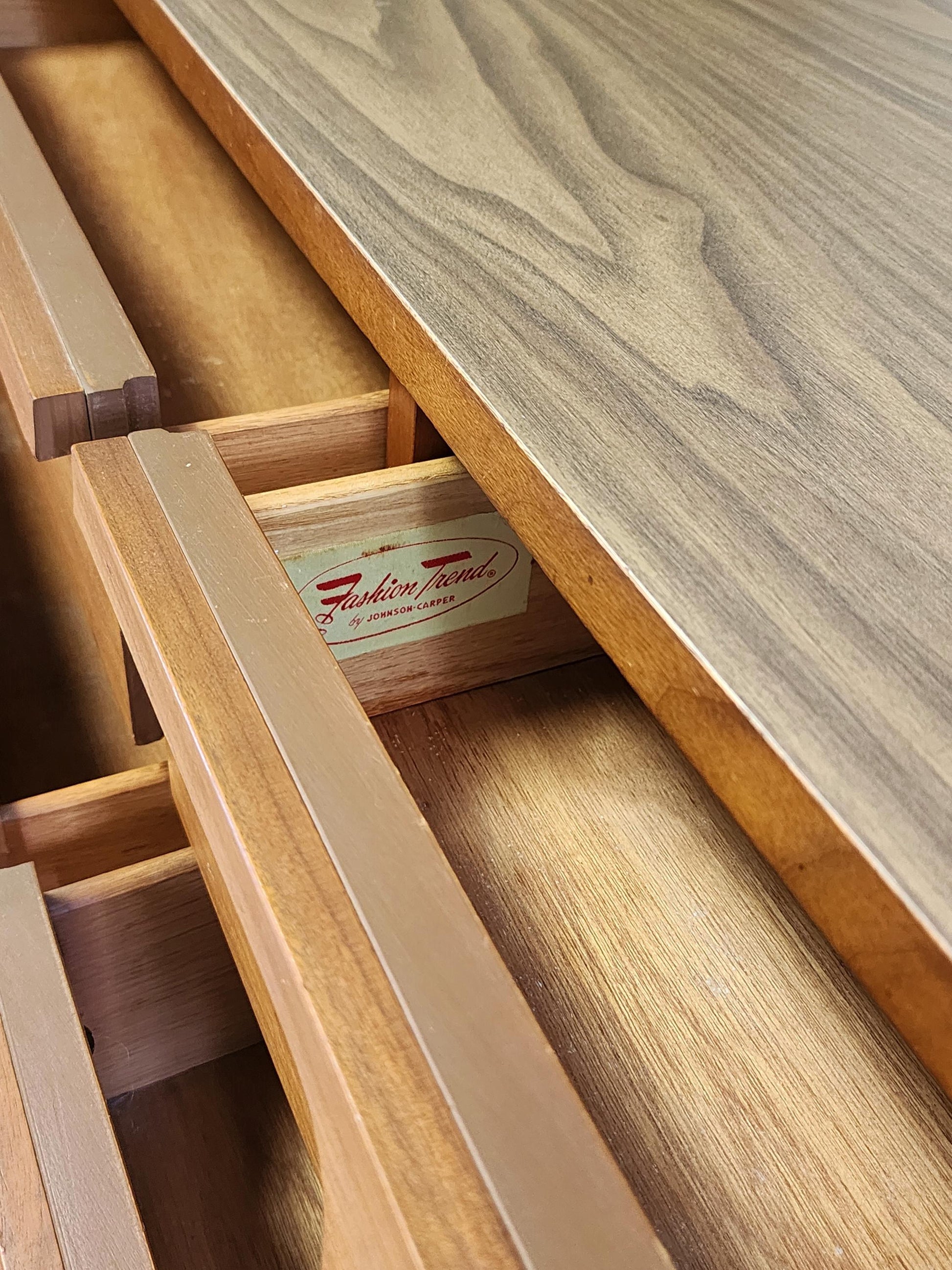 Wonderful Fashion Trend set by Johnson-Carper, ca 1960s. This consists of a 6 drawer long dresser and a 3 drawer low chest. These well made pieces are solid wood, with walnut veneers and hard wearing scratch resistant faux wood laminate tops. Overall very good vintage condition, with some hard to see veneer chips/loss to feet, edges, etc. Otherwise both present wonderfully. Drawers are roomy, slide well and feature stylish sculpted wood handles. Each piece also available separately.