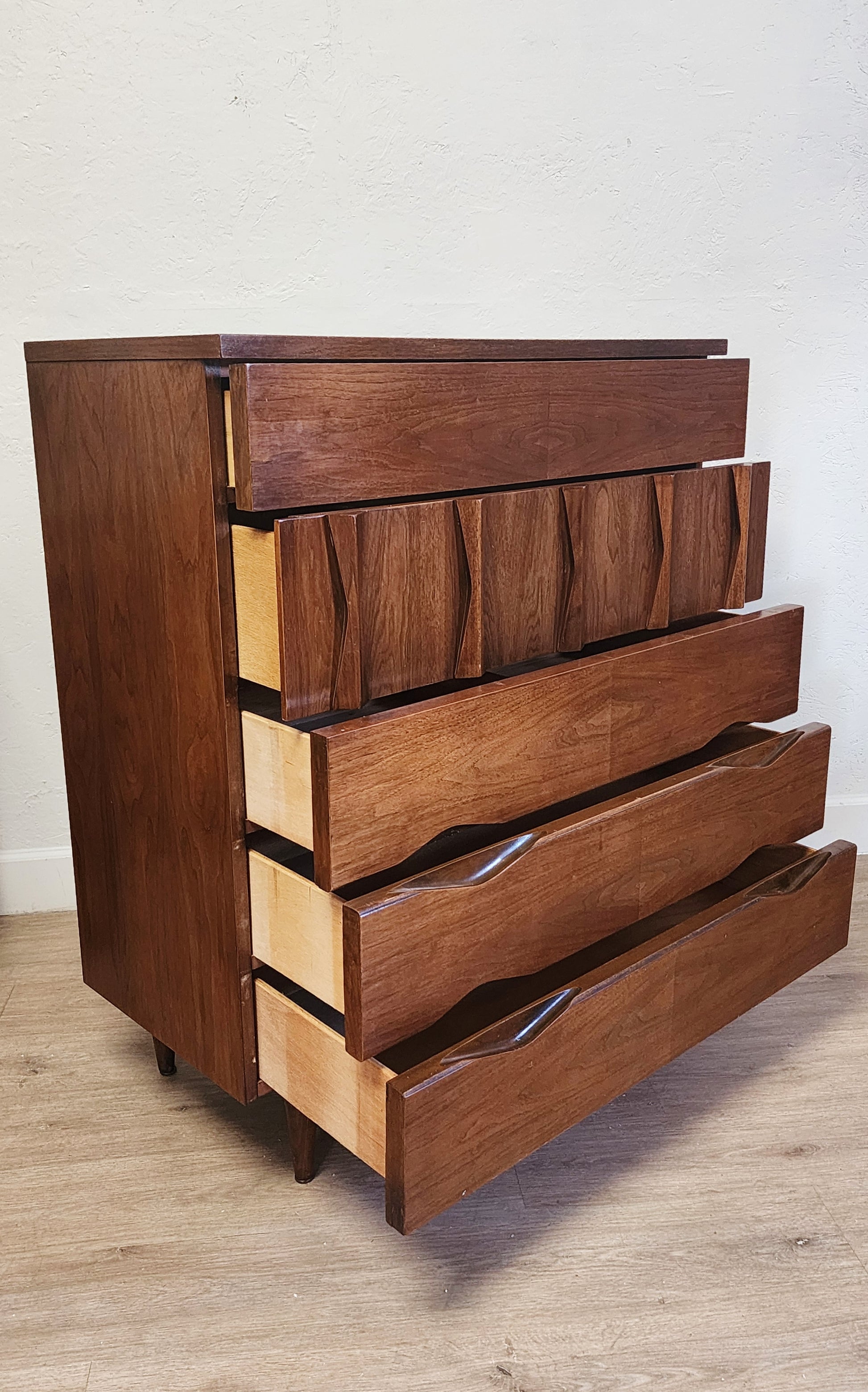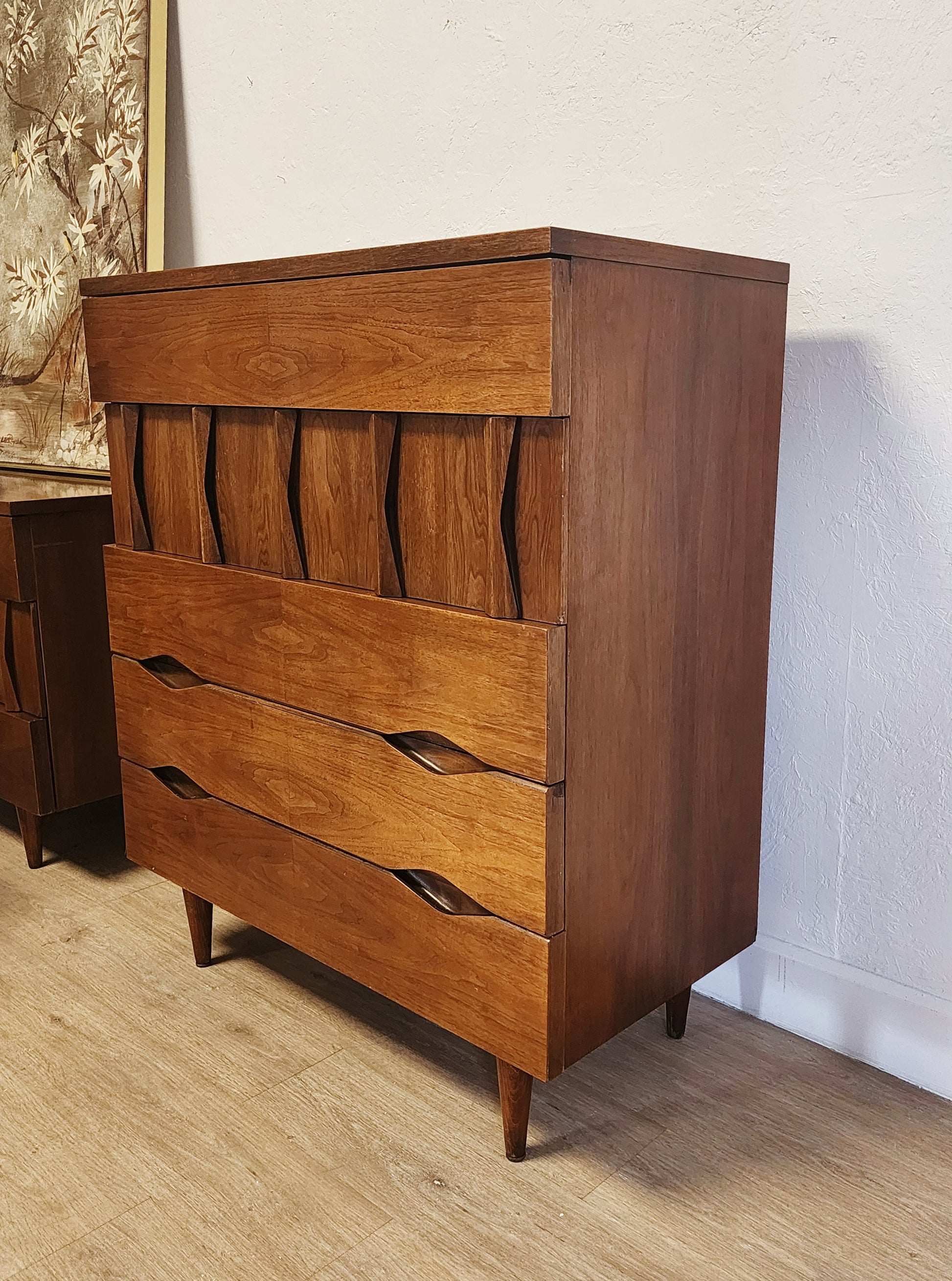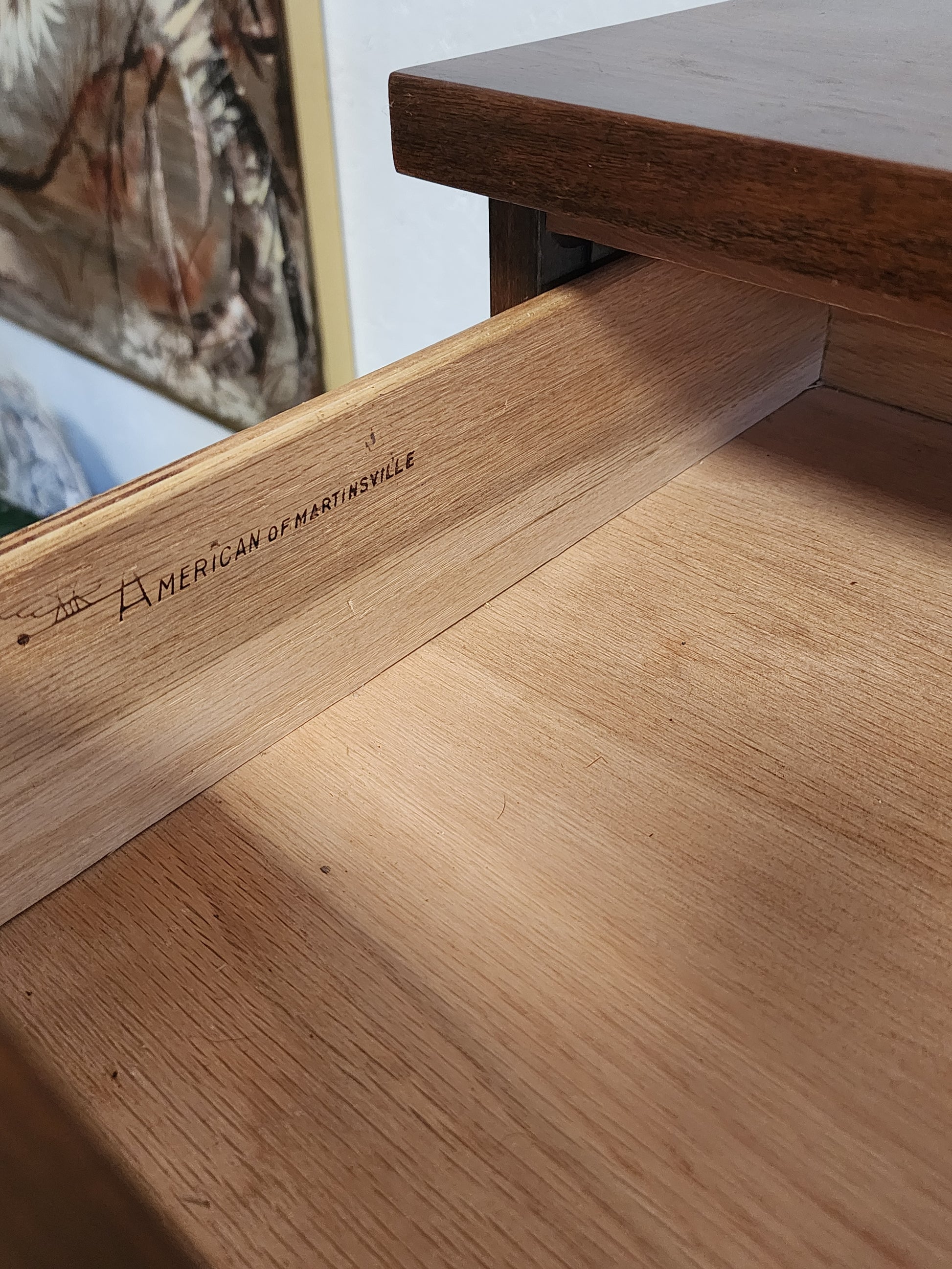 Condition notes: Overall great vintage condition with some expected wear here and there. There is a small area of veneer loss at very bottom side edge of dresser (hard to notice) and some veneer chips on a drawer edge on the tallboy.