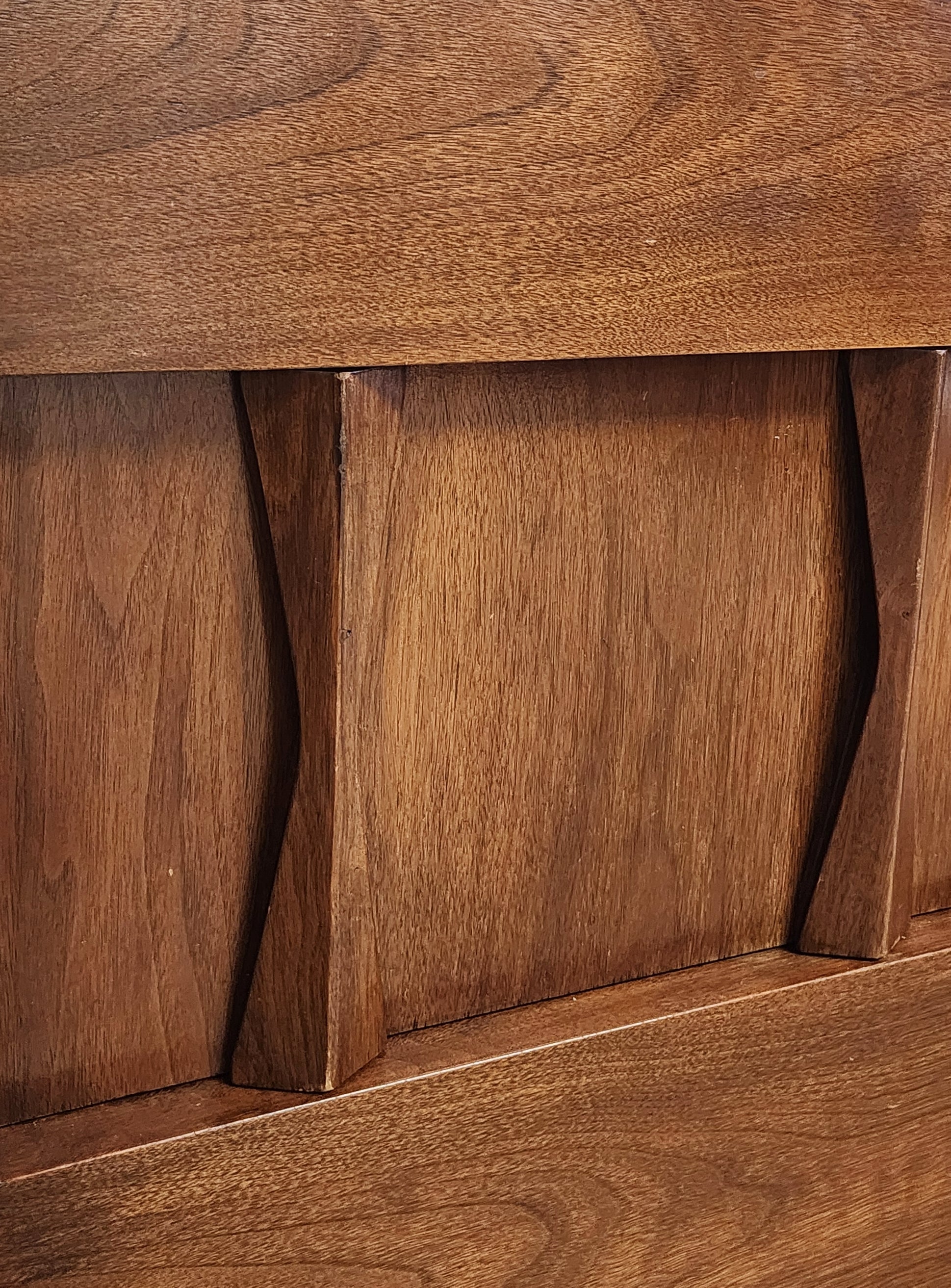 All pieces feature beautiful wood grain (most likely walnut), tapered legs and vertical bowtie style sculptural handles. Very solid and heavy, drawers function well and offer tons of storage.
