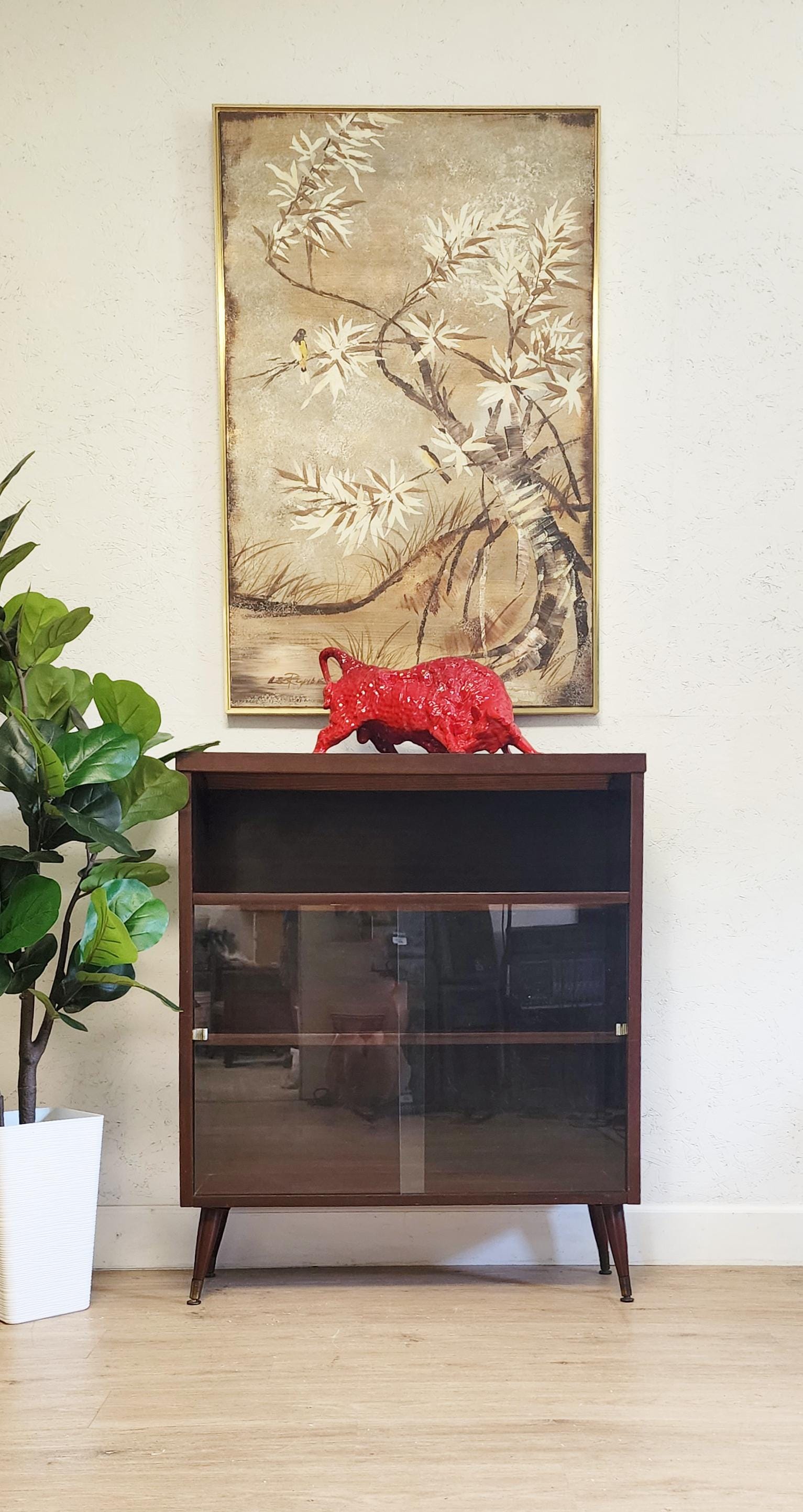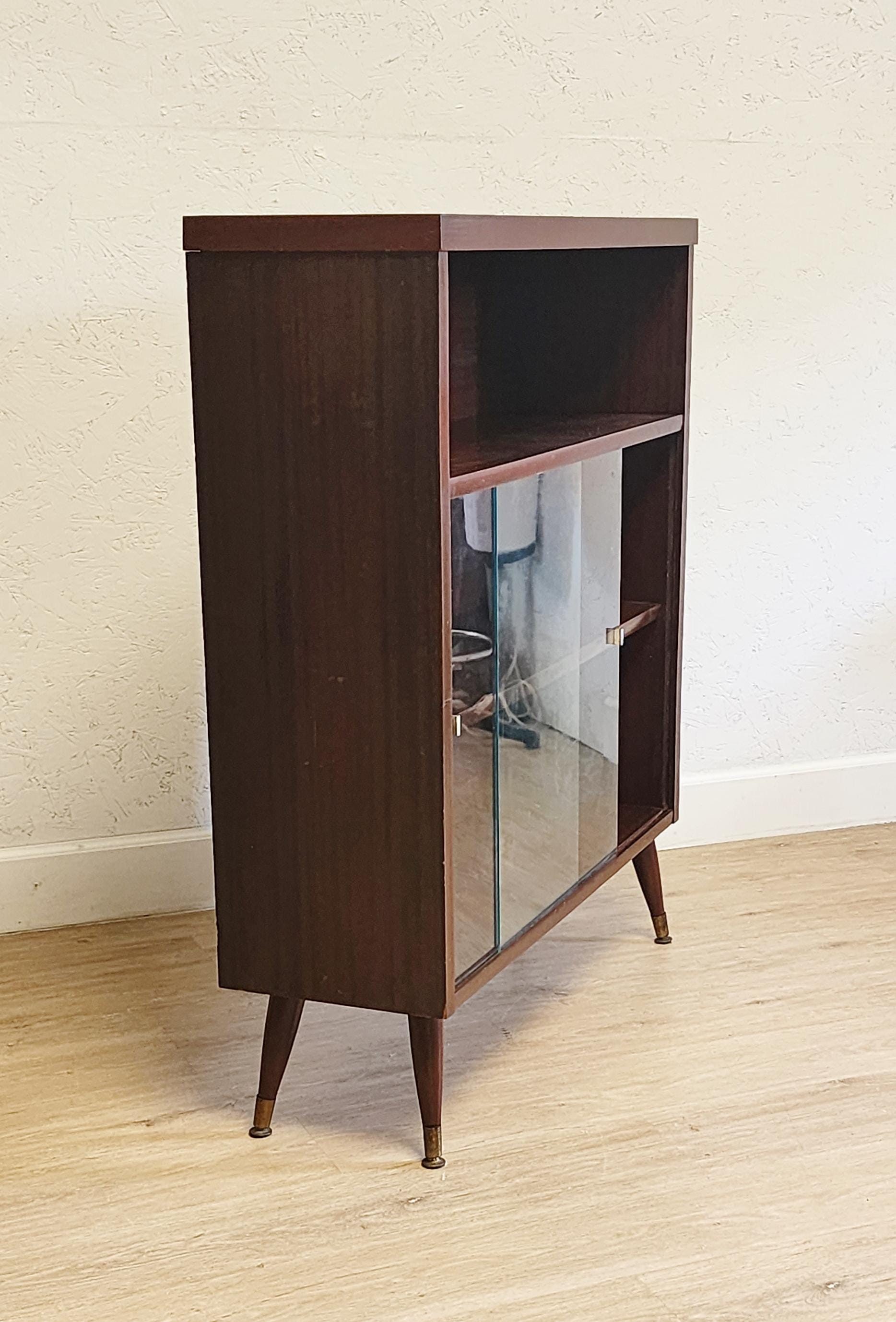This is a deep mahogany toned floor cabinet featuring two sliding doors (removeable), and atomic style tapered legs with brass caps. Three levels inside for your books, collection or bar items.