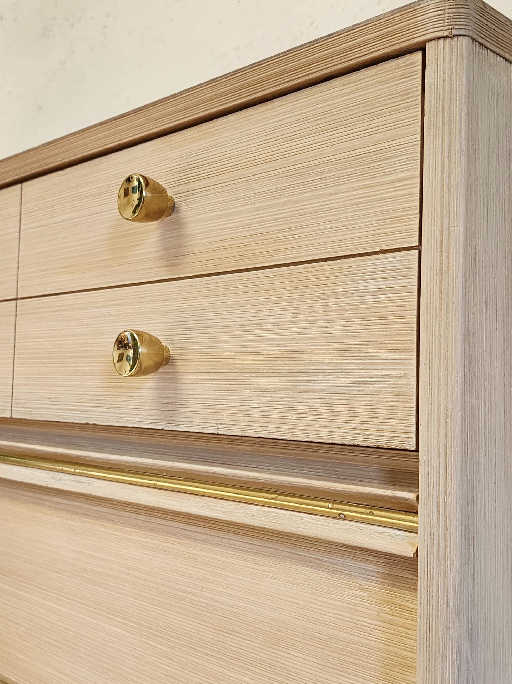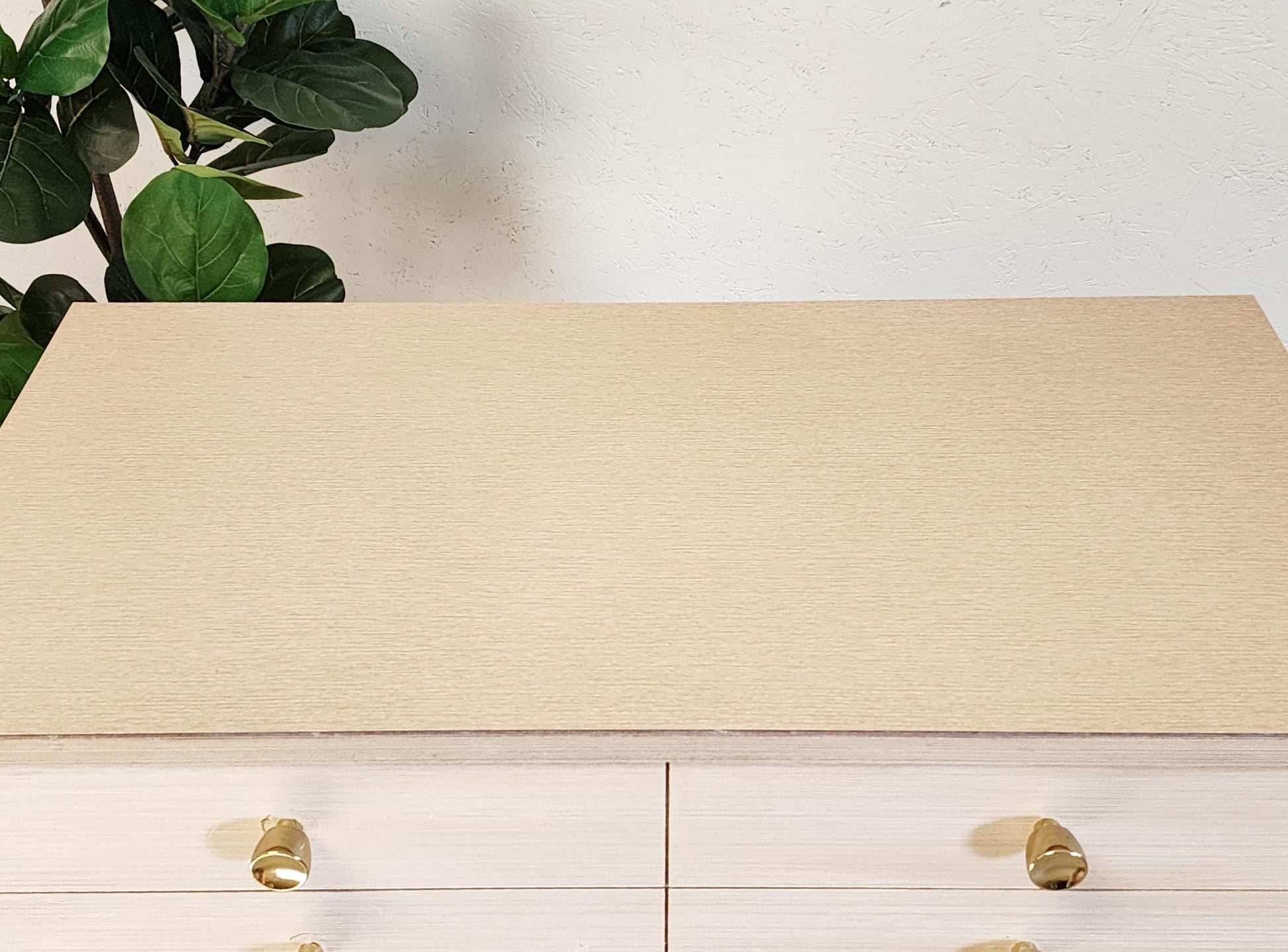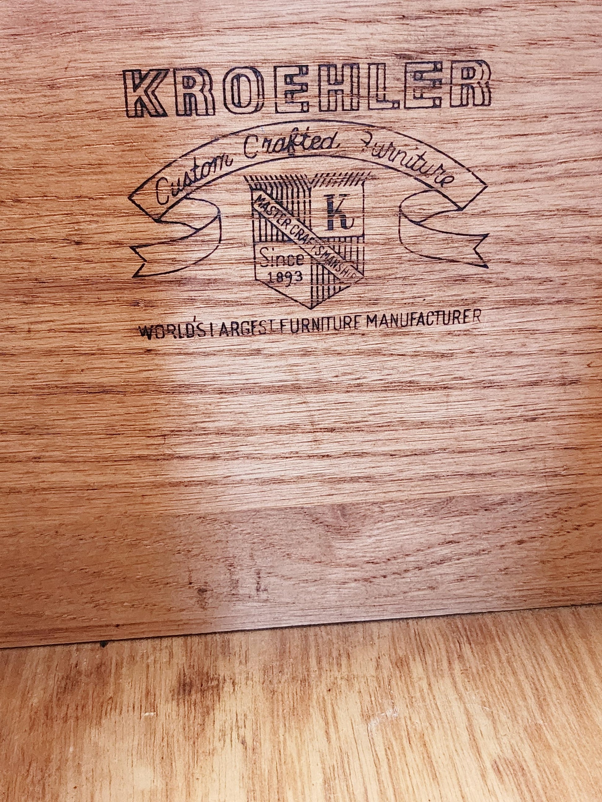 This four drawer tallboy chest from Kroehler has been lightly refreshed in a close-to original tan/sandy/blonde finish, with four new old stock vintage original pulls on the top drawer. Heavy, solid and quality Kroehler construction, this has a striated laminate original top, and cerused combed finish cabinet. The three lower drawers feature sculptural long wood and gold tone finger pulls. Overall very good vintage condition underneath the new finish, with some wear marks and scrapes visible but not too noticeable, mostly on the sides. Size, approx: 34.25 inches wide x 17.75 deep x 42 inches tall. Great MCM piece to complement a modern coastal or minimalist room. Please see all the photos, zoom in and ask any questions prior to purchase. IMPORTANT INFO: ~If you have any questions please contact us PRIOR to purchasing the item. ~All sales are final. ~We are more than happy to answer any questions, take video or extra photos prior to purchasing an item. ~Please keep in mind that nearly all items in our shop are vintage and pre-owned. Some items may have vintage wear shown in photos and described in listing. ~Items ship professionally--all orders are carefully packaged and insured and will ship via Fedex within a few days of purchase. Larger items shipping via private blanket wrap transporter can take 1-3 weeks to arrive.