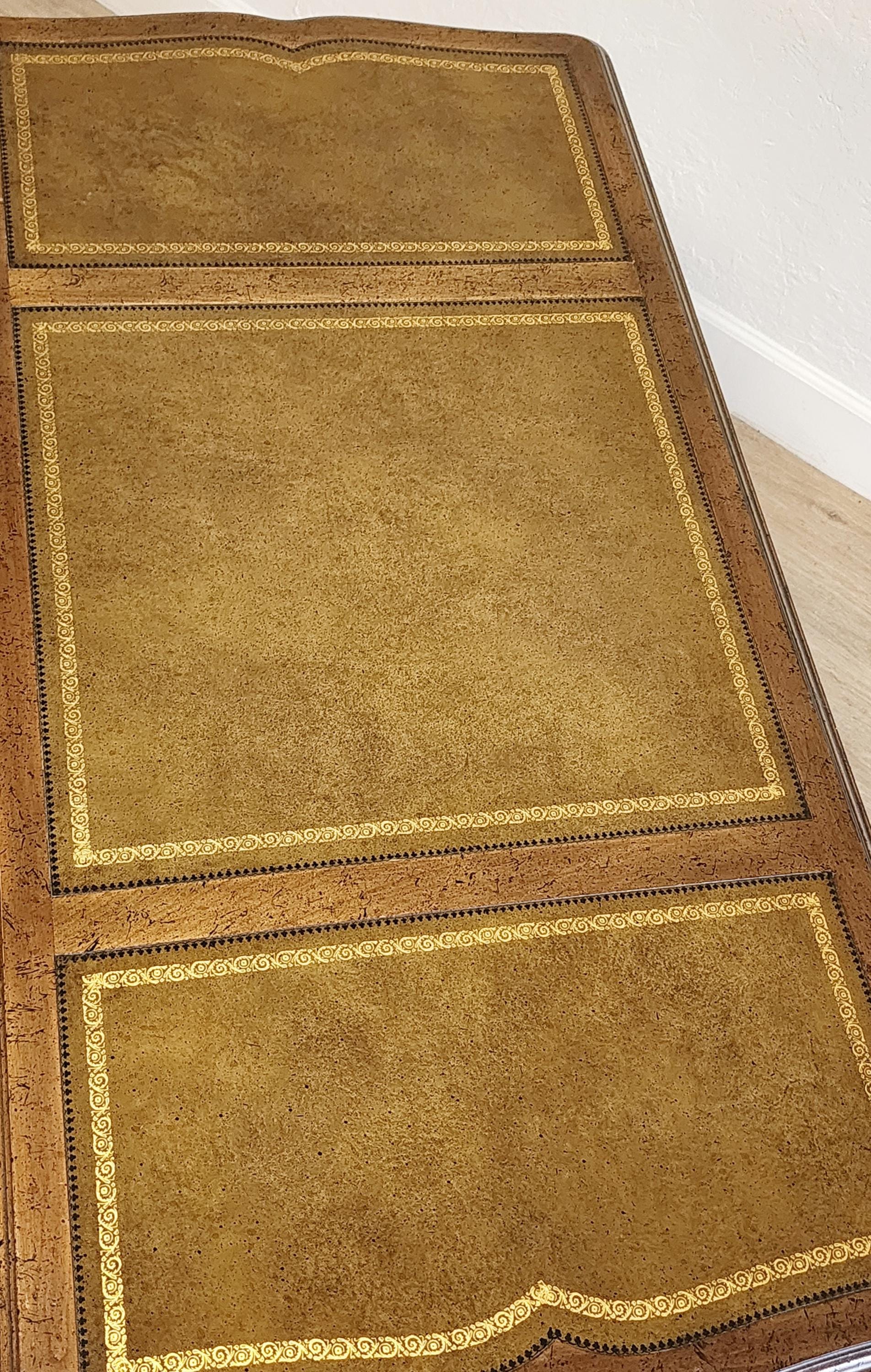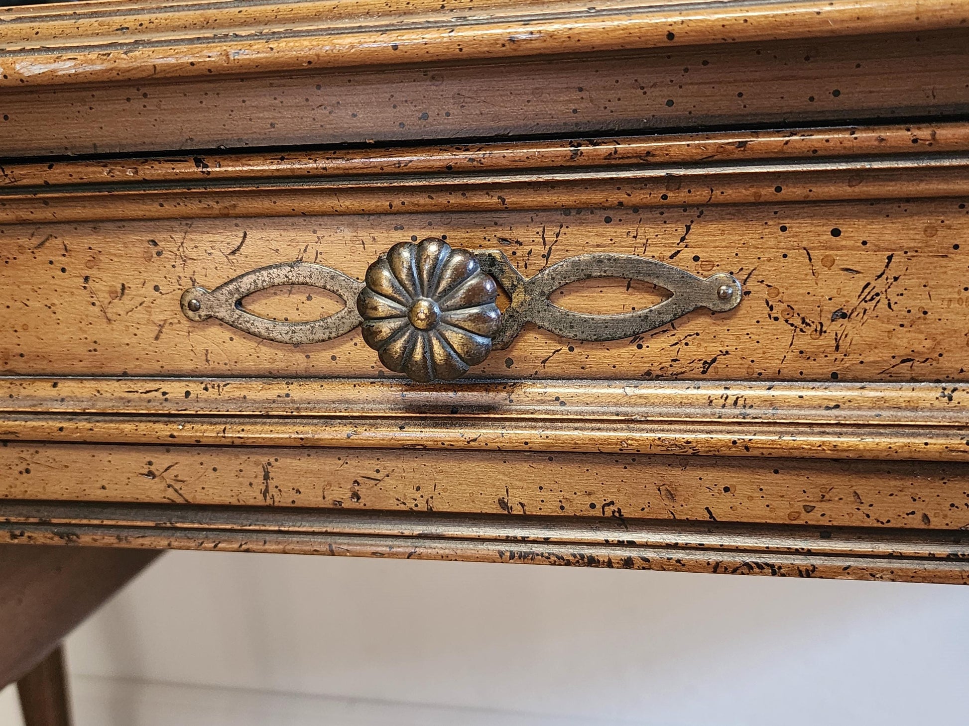Sligh-Lowry Leather Top Writing Desk This vintage desk is in the French Country style with original medium brown distressed finish, tan/gold leather tooled top and cabriole legs. Four functioning drawers, finished back. Nice smaller size for use as a desk, entry console or bedroom vanity. Custom finish color option, ask for color samples prior to purchase. Size: Approx 47.5 x 24 x 29 inches tall Kneehole: 23.25 tall x 19 inches wide Please see all the photos, zoom in and ask any questions prior to purchase.