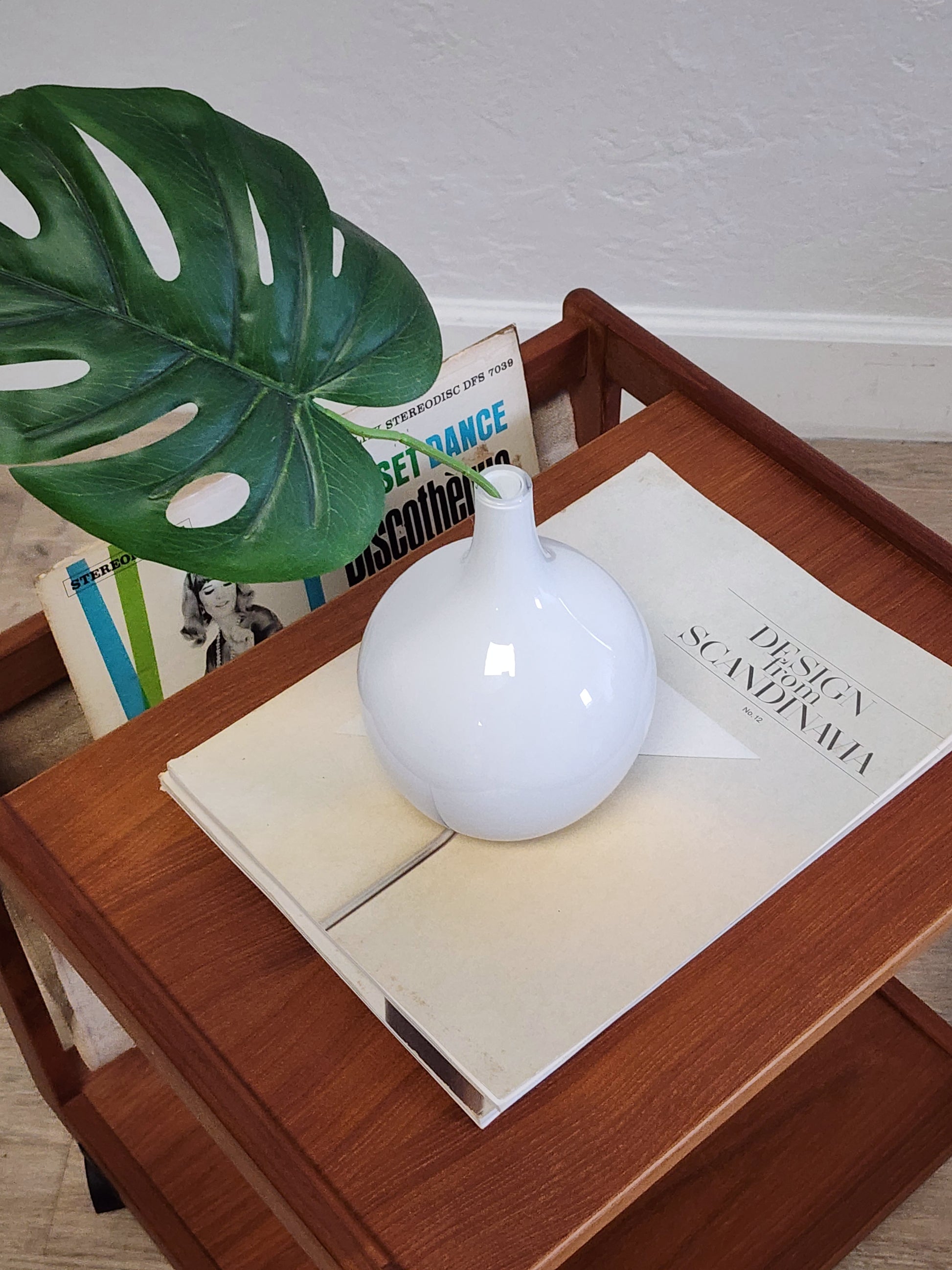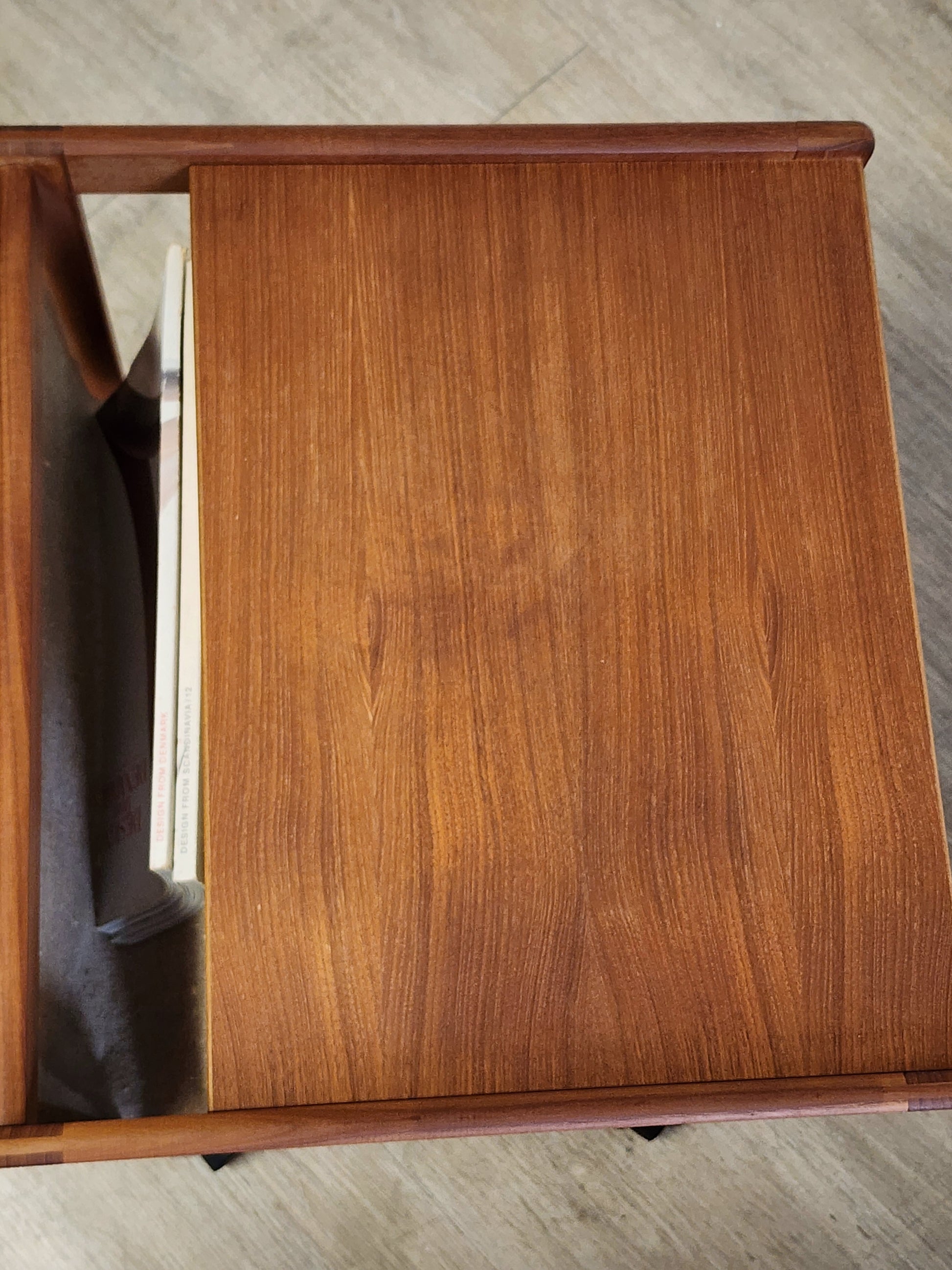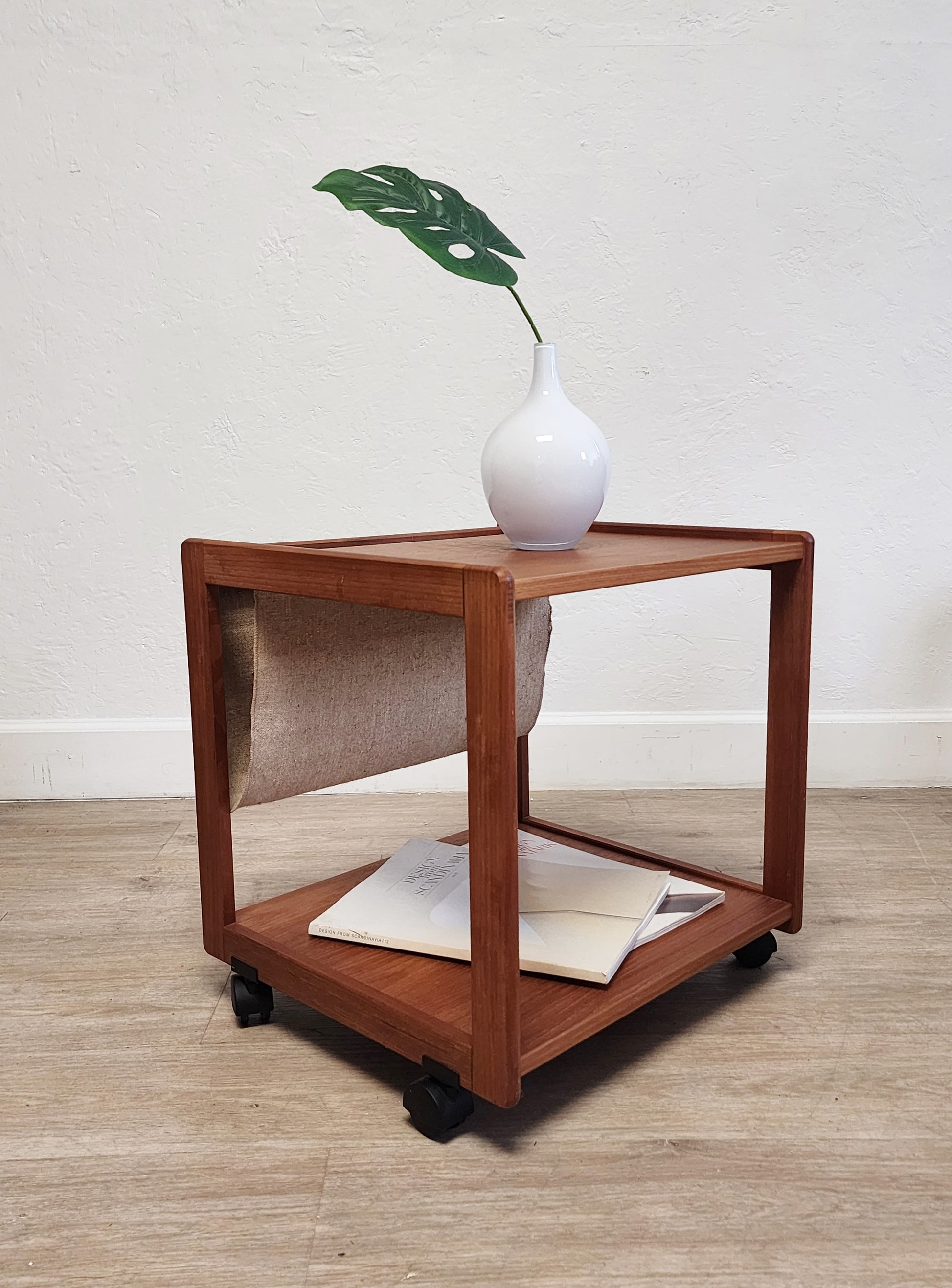Vintage Danish Teak Rolling Table Magazine Rack w/ HEMP Sling FBJ MOBLER Denmark