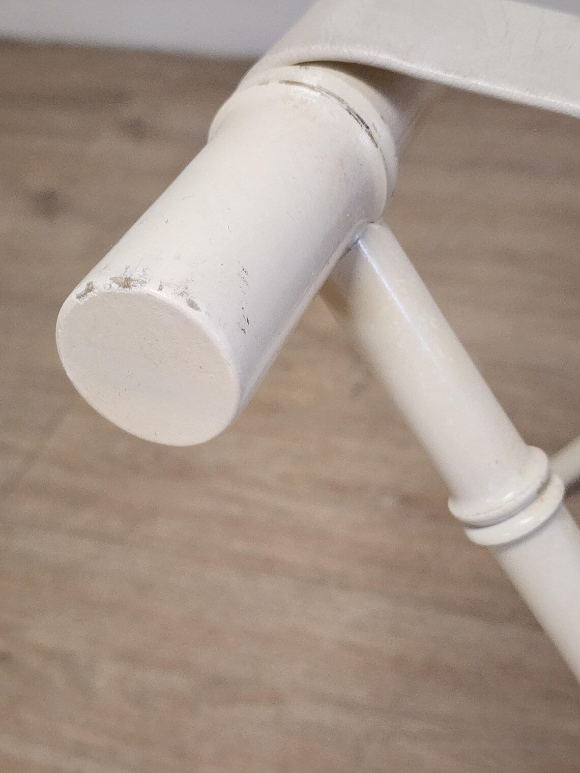 This folds when not in use. Lovely slightly chippy off white painted vintage wood frame. The straps are an off-white faux leather. Overall very nice vintage condition, with some small scuffs/marks here and there. Approx. measurements are 22 inches long x 15 inches deep x 20 inches tall. Perfect for a side table with tray, or as small suitcase holder in guest room, etc. Photos show examples of tray/basket for reference only. The photos are considered a large part of the listing/description, so please view all and zoom in. Ask any questions prior to purchase!
