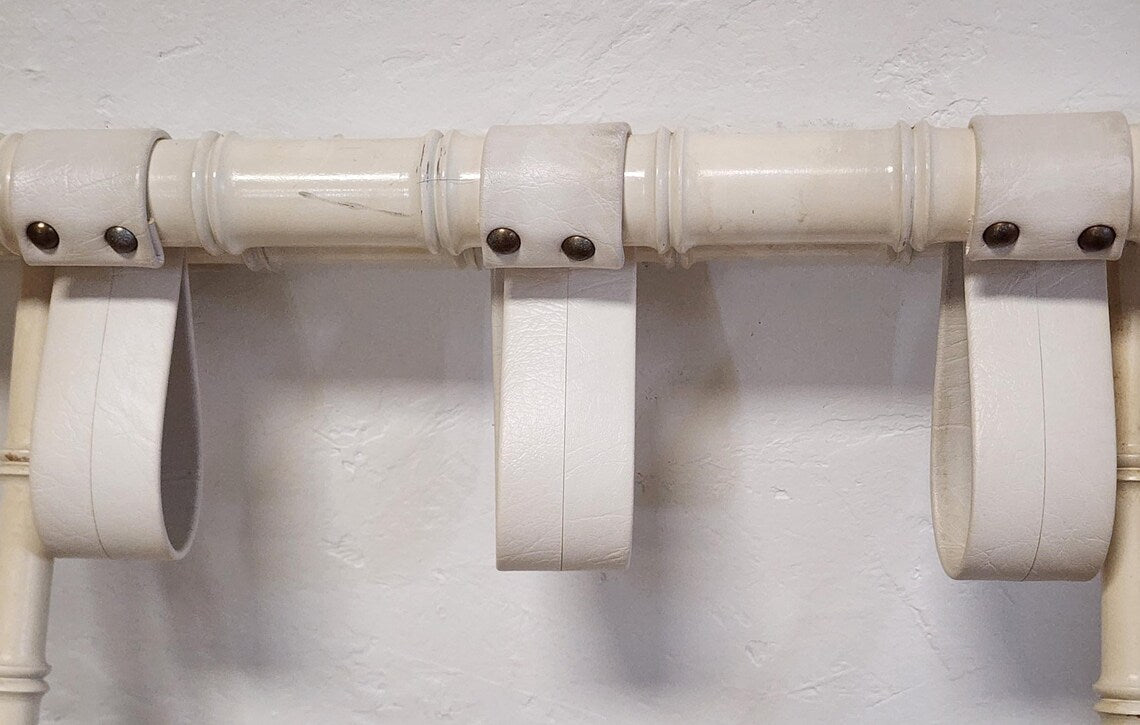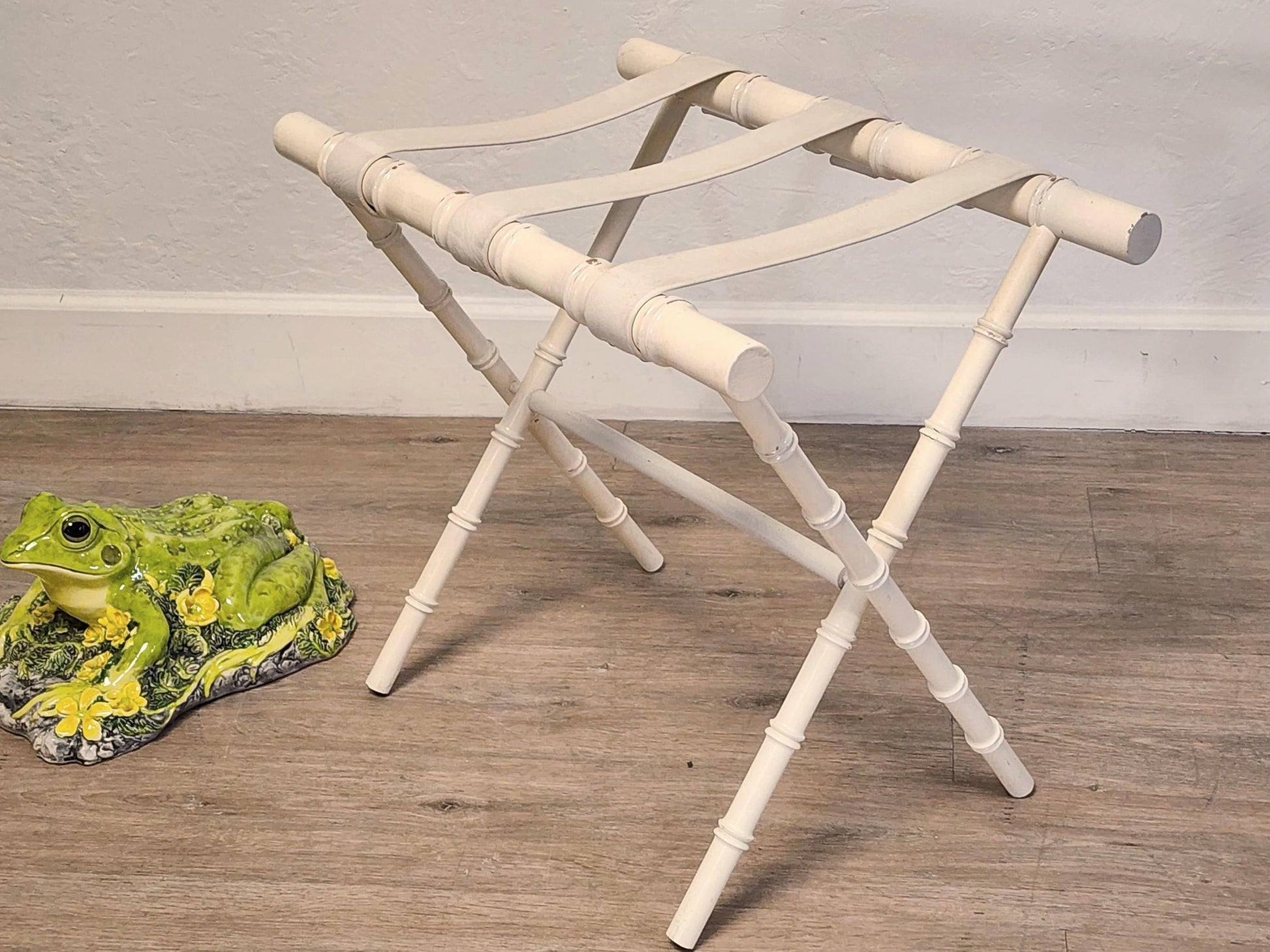 Vtg Faux Bamboo Style White Folding Luggage Rack -Palm Beach Coastal Suitcase Stand w/ Faux Leather Straps